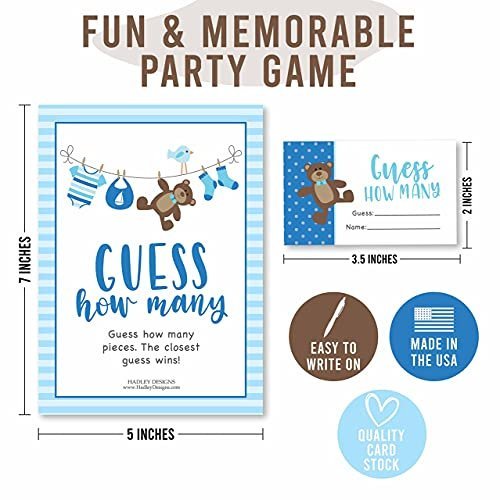 - Memorable Baby Shower Game; you'll receive 1 5x7 guess how many candy in the jar double-sided sign and 25 3.5x2 guess how many cards; perfect for baby shower decorations for boy and baby boy shower games