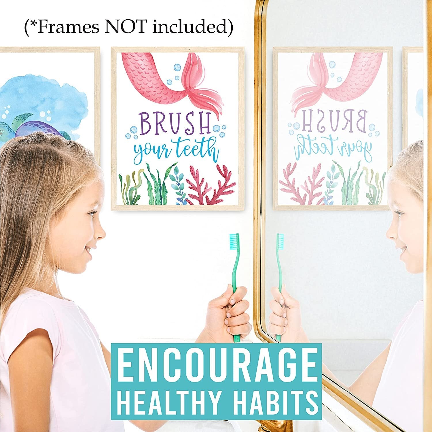 - Encourage Hygienic Habits; You'll receive 6 reversible 8x10" bathroom sign prints, which means you get 12 total bathroom picture designs (Frames not included); So your kid will never run out of encouraging bathroom decorations that will continue to help their habits stick