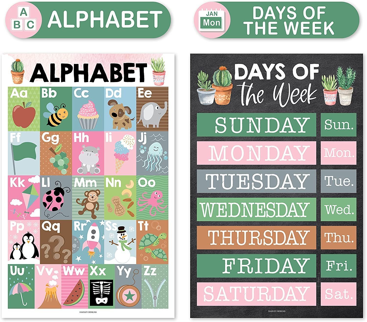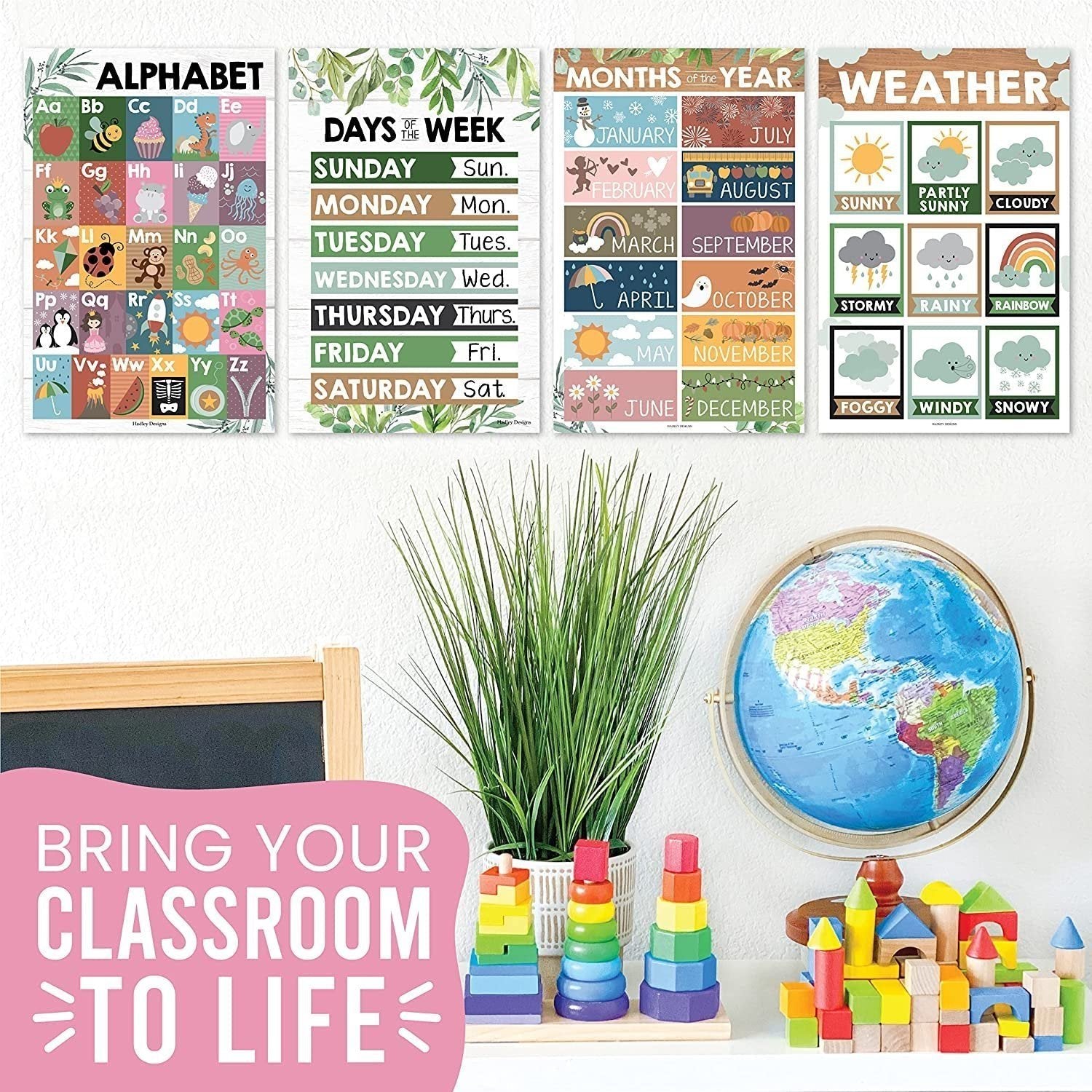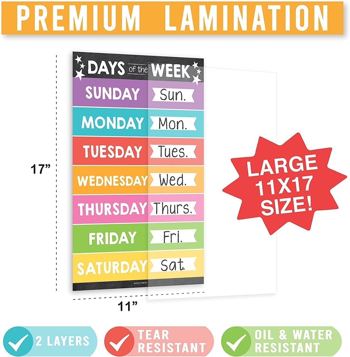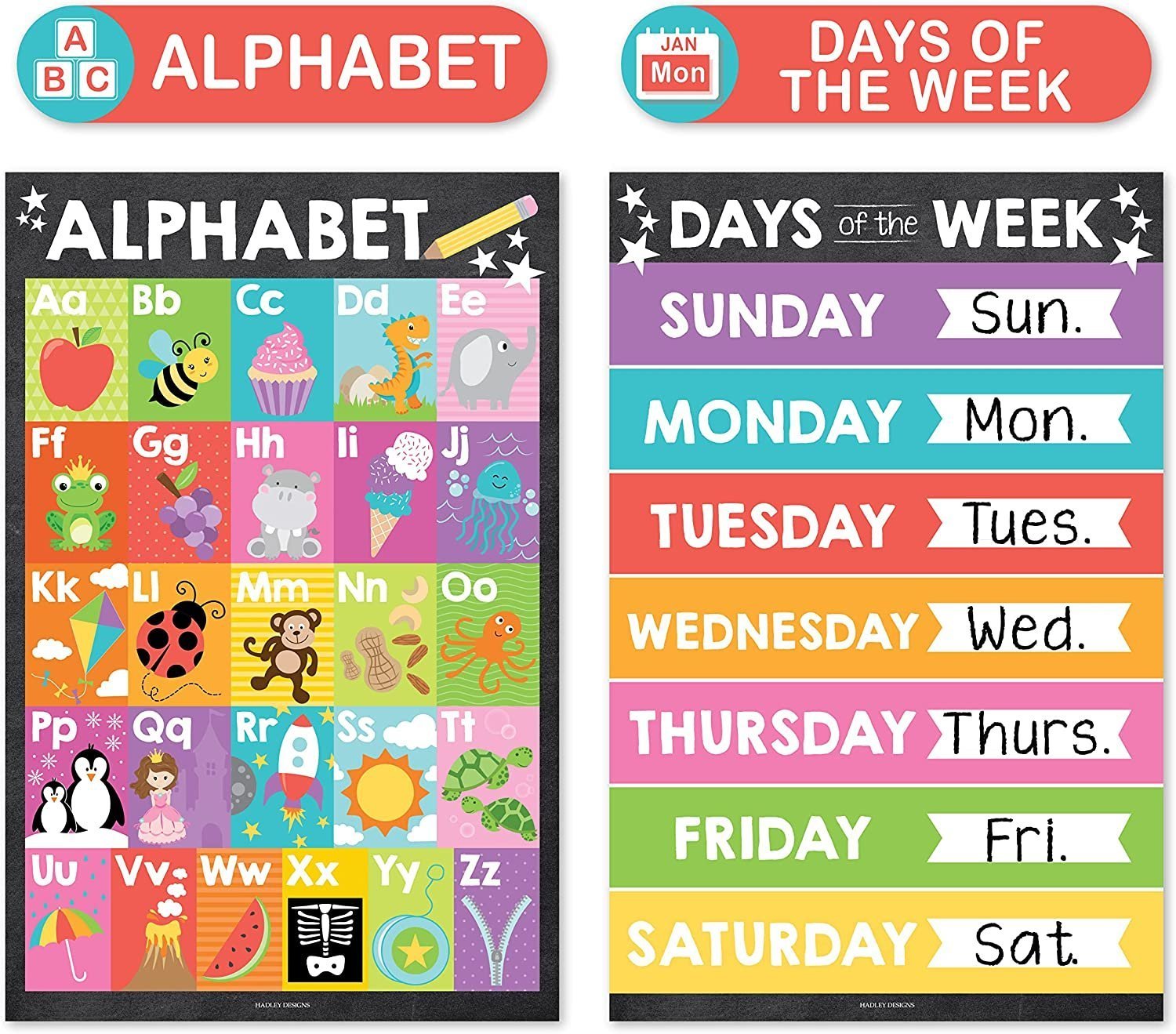 - Make Learning Fun; You'll receive 4 different 11x17" laminated posters, 1 - Alphabet Chart, 1 - Months Of The Year Poster, 1 - Weather Chart For Classroom, and 1 - Days Of Week Chart; Use these as preschool learning posters/preschool educational posters for kindergarten