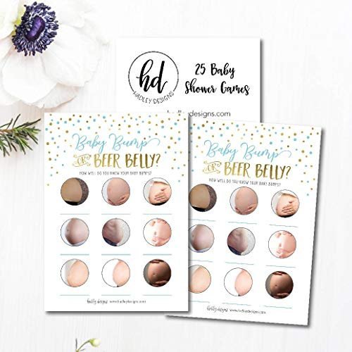 Impress your guests & help them have fun - answers included; Share lots of laughs with friends! 25 game boards included can you guess if it is a beer belly or a baby bump? Your guests are going to love this game and have so much fun! Lots of laughs will be shared!Share priceless memories with family & friends; These can be handed out as a game during a baby shower or sprinkle, gender reveal party & any get together to celebrate the arrival of the new baby girl or boy! They make the perfect party supplies. Easy to write on; Thick high quality cardstock makes them easy to write on compared to other baby shower game cards that are printed with a gloss finish. Order to see the difference thick card stock can make!DescriptionWhy should you order your own baby shower beer belly or baby bump game cards?· Durable – Printed on Premium Cardstock· Easy to write on· One of a kind design· Generous 5 x 7 size allows plenty of room to identify the picture.· Designed and Made in the USA· Impress your guests with a fun way to celebrate the new baby· 100% Money Back GuaranteeBONUS – The 5x7 size provides much more room for guests to fill in the blank spaces rather than a small 4x6 size.Use them as baby shower games for girl or boy babies, fun gender neutral reveal shower coed adult party favors, baby shower party supplies & ideas, Rustic Gold, pink, blue confetti games, party stationery items, baby shower games for the new mom to be or mommyWhy choose these Baby Bump Games?· These Beer Belly Games are a customer favorite!· They are unique and different from the mass produced & boring baby shower game cards.· It's the personal touch that make these baby shower games special.· Each card is handcrafted on heavy-weight extra smooth cardstock.· You will receive an exceptional product with meticulous attention paid to every last detail