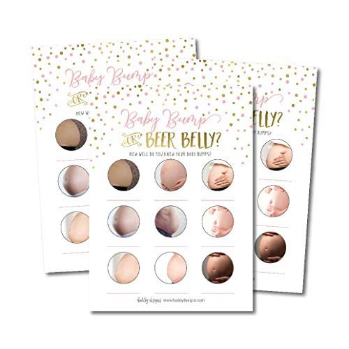 Impress your guests & help them have fun - answers included; Share lots of laughs with friends! 25 game boards included can you guess if it is a beer belly or a baby bump? Your guests are going to love this game and have so much fun! Lots of laughs will be shared!Share priceless memories with family & friends; These can be handed out as a game during a baby shower or sprinkle, gender reveal party & any get together to celebrate the arrival of the new baby girl or boy! They make the perfect party supplies. Easy to write on; Thick high quality cardstock makes them easy to write on compared to other baby shower game cards that are printed with a gloss finish. Order to see the difference thick card stock can make!DescriptionWhy should you order your own baby shower beer belly or baby bump game cards?· Durable – Printed on Premium Cardstock· Easy to write on· One of a kind design· Generous 5 x 7 size allows plenty of room to identify the picture.· Designed and Made in the USA· Impress your guests with a fun way to celebrate the new baby· 100% Money Back GuaranteeBONUS – The 5x7 size provides much more room for guests to fill in the blank spaces rather than a small 4x6 size.Use them as baby shower games for girl or boy babies, fun gender neutral reveal shower coed adult party favors, baby shower party supplies & ideas, Rustic Gold, pink, blue confetti games, party stationery items, baby shower games for the new mom to be or mommyWhy choose these Baby Bump Games?· These Beer Belly Games are a customer favorite!· They are unique and different from the mass produced & boring baby shower game cards.· It's the personal touch that make these baby shower games special.· Each card is handcrafted on heavy-weight extra smooth cardstock.· You will receive an exceptional product with meticulous attention paid to every last detail