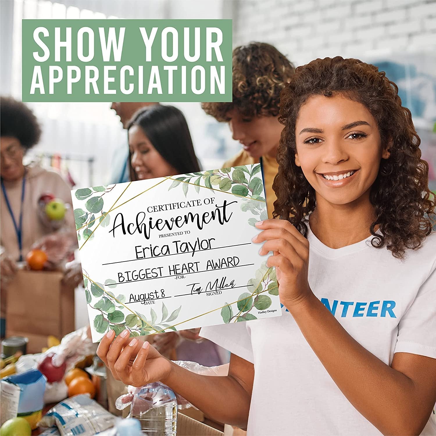 Looking to reward achievements? Then you need these certificates of achievement for kids and adults! Whether you're looking to celebrate success at the office, in the classroom, or on the sports field; these reward certificates for students, children, and adults are a simple way to recognize a job well done. 8x10 Inch Awards Certificates For Kids And Adults—25 Certificates Included! Thick, Non-Flimsy Cardstock Made In The USA Ships Flat To Avoid Crumpling These 8x10 inch awards for kids and adults include 25 total award certificates, so you'll never run out of certificates and awards to recognize achievements. Additionally, these adult and kids certificates include large, easy-to-fill-in spaces—so you can to create 100% personalized awards (perfect for giving people a sense of self-pride!). And unlike cheap award paper certificates that are made overseas, our elegant certificates of appreciation and achievement are made in the USA with thick, non-flimsy cardstock. Use these as a botanical certificate of achievement award, eucalyptus plant student of the month awards, a sports certificate, faux style kindergarten certificates of completion, green, gold, black and white honor roll certificates, gold star end of year awards for students, garden themed prek graduation certificates with geometric invitations, abstract kindergarten graduation diploma with metallic abstract lines / kindergarten graduation certificates for kids, positive behavior nice list certificate for kids, or other award certificates kids love. Perfect to use as graduation diplomas for 2022, 2023, 2024, 2025, 2026, 2027, 2028, 2029, or 2030. Our family-owned business wants to help you celebrate and reward excellence. If you have questions about our modern office awards, gray watercolor themed kindergarten diplomas, or our gender neutral sports certificate awards, please don't hesitate to reach out. We're always here to help!