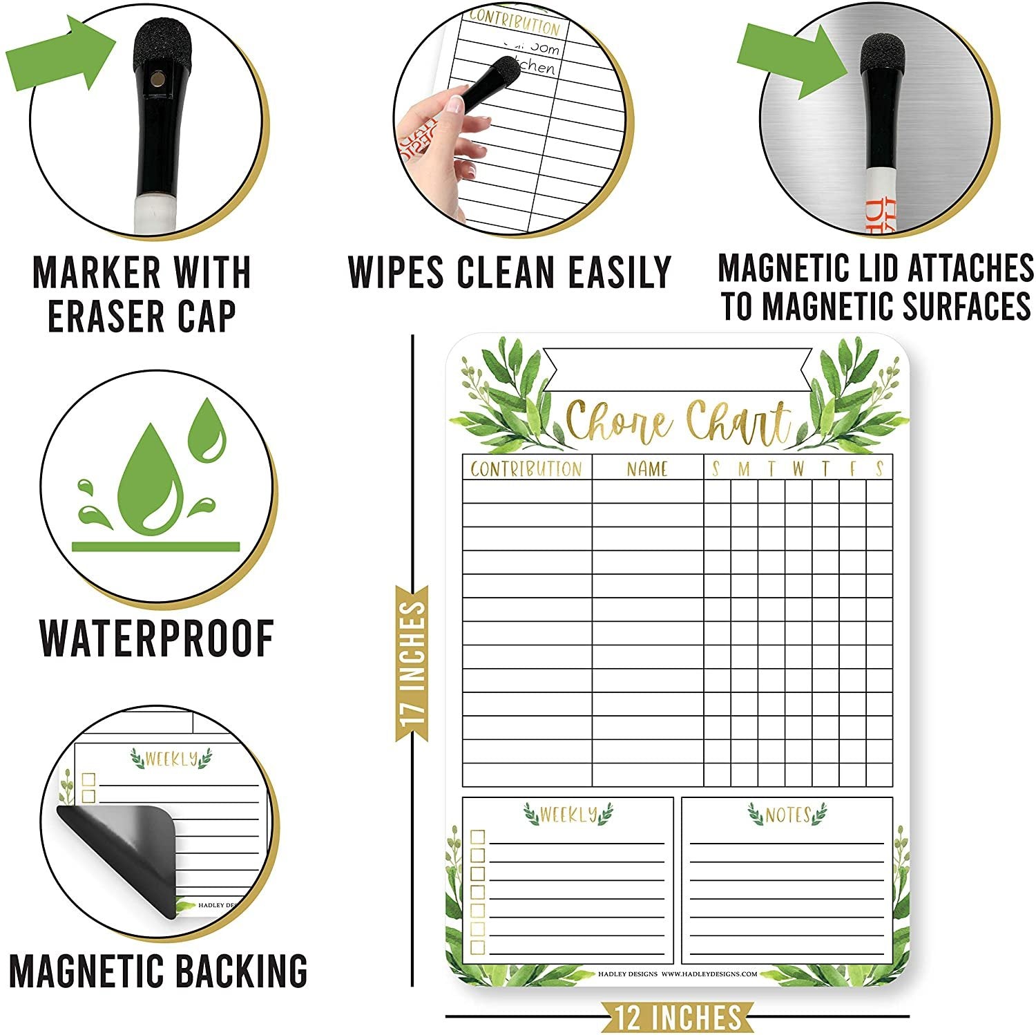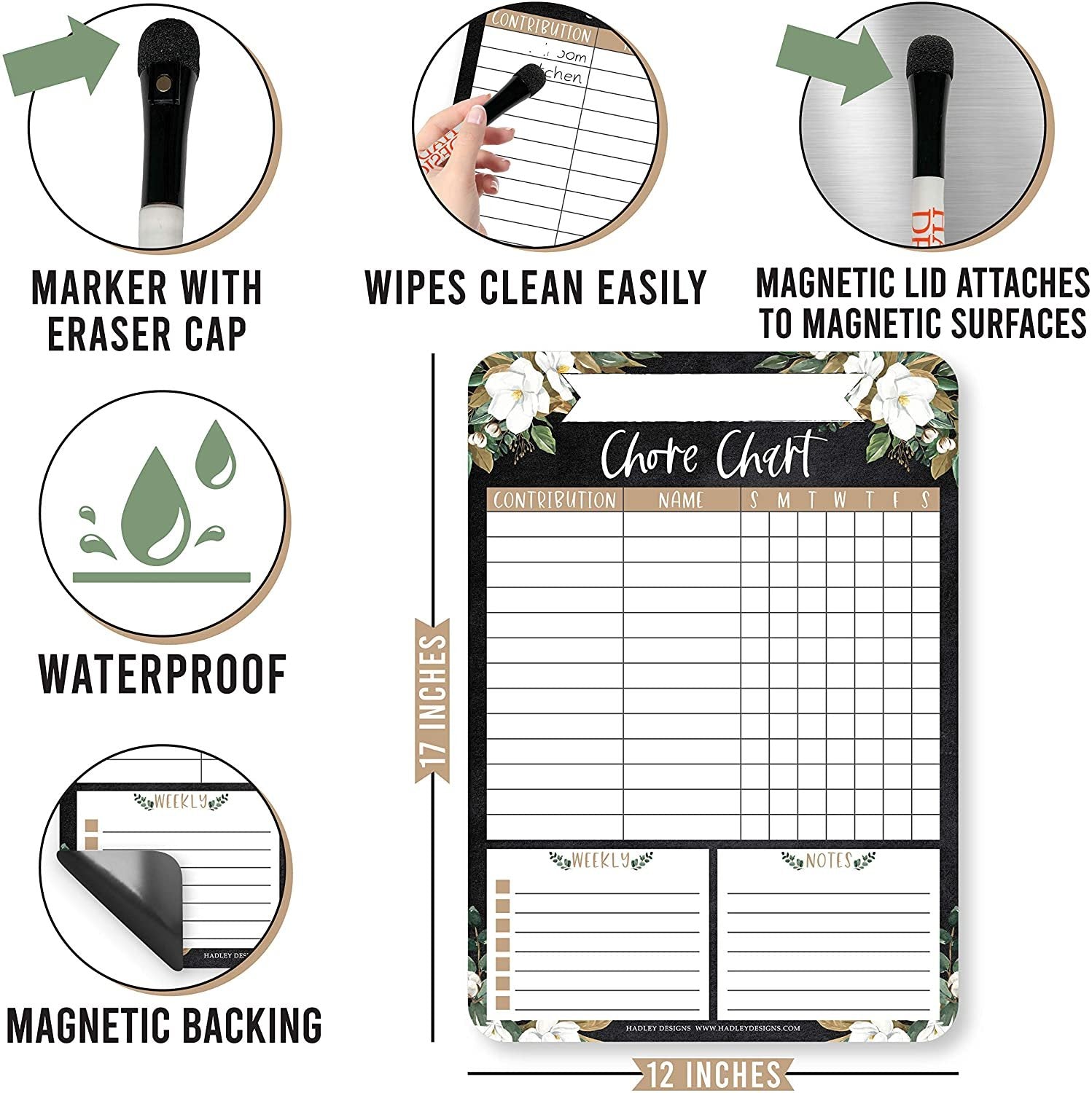 - Bring Harmony To Your Home; You will receive 1 12x17 magnetic chore chart for kids and adults with space for daily and weekly chore list, 1 marker, and age appropriate chore tips; This black and white large family chore chart keeps all on task