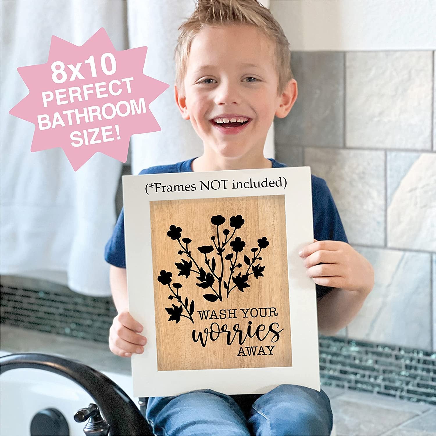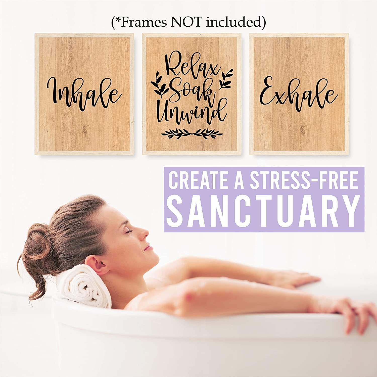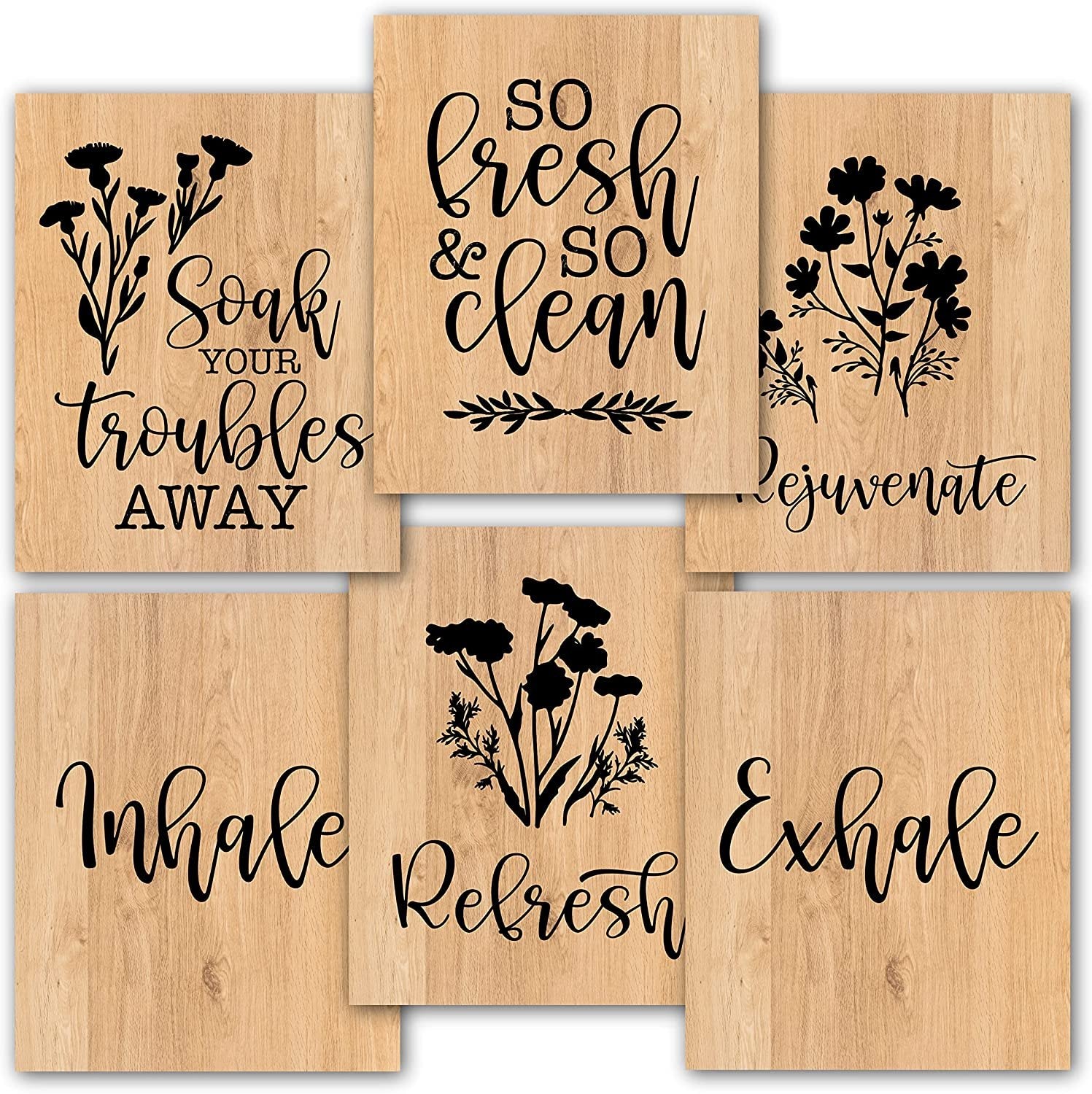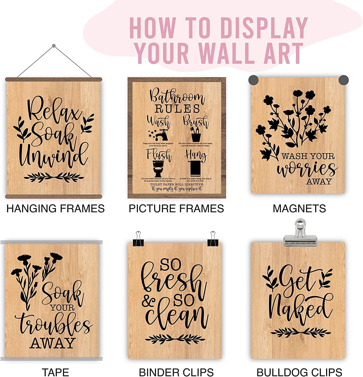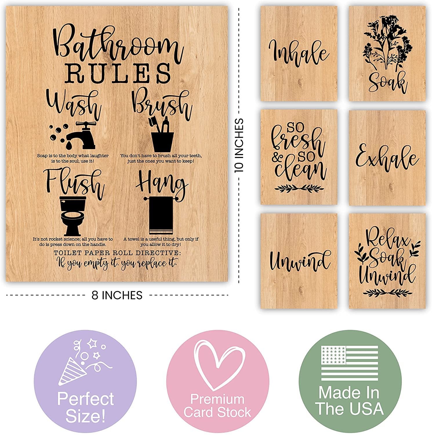 Make your bathroom feel like a spa! Just imagine lighting a candle. Easing into a lukewarm bath. And releasing all of your day’s tension as these deeply calming bathroom decor rustic signs guide your mind into a state of complete relaxation. Because everyone deserves a little me-time. And these modern farmhouse bathroom decor signs are just what you need to easily create a soothing spa-like bathroom (on a budget). So whether you plan to use these vintage wall art bath signs for your master, secondary, or guest bathroom; our wall decor bathroom signs are sure to turn any bathroom into a stress-free sanctuary. Relaxing 8x10 inch Farmhouse Bathroom Signs Includes 6 reversible prints, for 12 total designs Made in the USA with thick cardstock Easily fits inside a frame (frame not included) These shabby chic bathroom signs decor farmhouse posters feature a set of 6 double-sided prints—for a total of 12 designs, so you'll never run out of new bathroom sign decor to impress guests. Simply mix and match these bathroom pictures wall decor prints in any order or layout, and change the look of any room in just minutes. These neutral bathroom pictures for wall feature comforting designs like the inhale, exhale, unwind signs, wash your hands sign bathroom decor with black words, western wood barn bathroom rules sign, greenery botanical floral pictures for a bathroom signs, and elegant get naked bathroom sign get naked bathroom decor signs Our family owned business wants to help you create your dream, spa-like bathroom. These boho bathroom wall decor farmhouse style signs are designed to help you relax. Made in the USA, our country farmhouse bathroom sign sets are printed on thick cardstock, so your farm home wall decorations for bathroom will last for years. If you have questions about our bathroom artwork for wall small bathroom decor, please don't hesitate to reach us. We're always here to help!