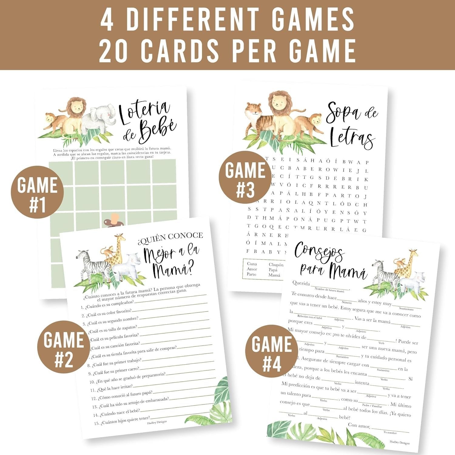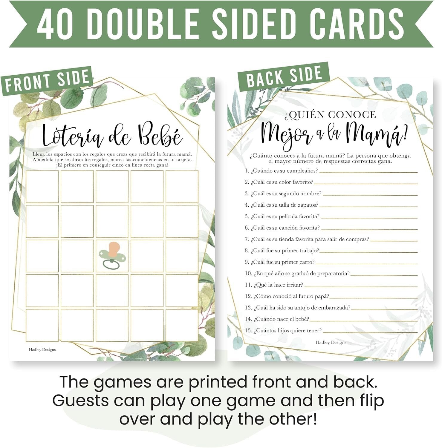 - Make The Mom-To-Be Feel Cherished; You'll receive two sets of 20 double-sided 5x7 inch hilarious baby shower games, complete with answer sheets, so you can play four different Spanish games with a group of up to 20 people