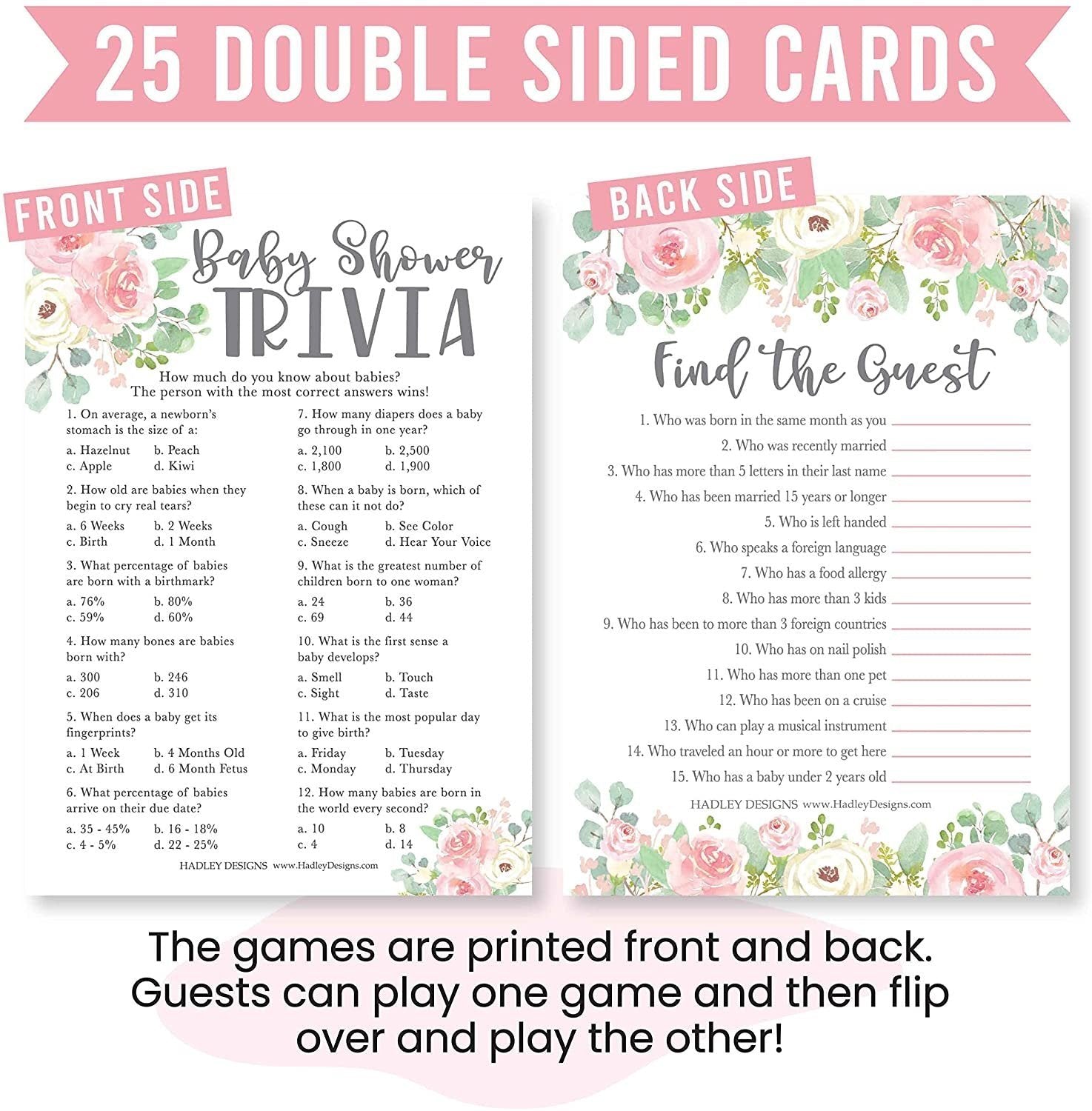 - Create a Memorable Baby Shower While Entertaining Guests; 2 double sided games and answer keys included; You’ll receive 25 baby trivia baby shower game and 25 find the guest baby shower game; Our games are sure to involve and delight all your guests
