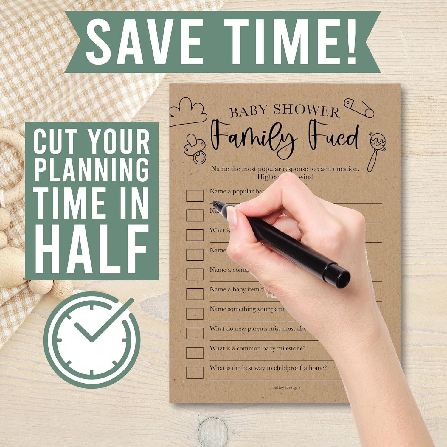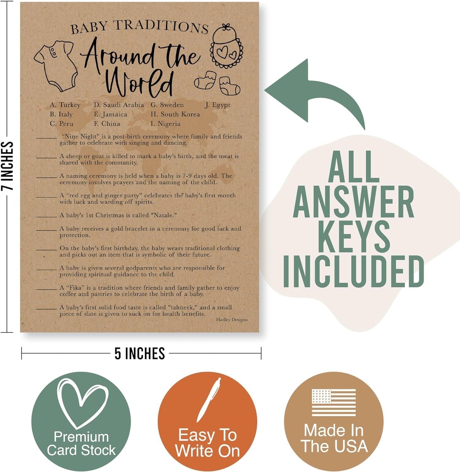 Looking to set the tone for an unforgettable baby shower? Then add some fun to your celebration with these games! These baby shower games are a hilarious way to inspire endless laughter while creating memories that last a lifetime. 5x7 Inch Baby Shower Games 2 Sets Of 20 Double-Sided Cards Included Answer Sheet Included Proudly Designed In The USA You'll receive two sets of 20 double-sided 5x7 inch baby shower games, so you can enjoy 4 different games with up to 20 people! Each baby shower game bundle is complete with an answer sheet. These hilarious games will be the highlight of your celebration, filling the room with non-stop laughter and creating cherished memories for all. Inspire contagious laughter by using these as funniest baby shower games ever, baby gender reveal party supplies, baby shower ideas, baby gender reveal party ideas, gender reveal supplies, gender reveal games for party, gender reveal theme ideas, baby reveal party games, baby shower party supplies, games for gender reveal, baby gender games, baby shower themes, gender reveal games cards, juegos para baby shower, juegos de baby shower, cool baby shower games, he said she said baby shower, mom or dad baby shower game, favorite family tradiitons baby shower, family traditions baby shower, family tradition cards for baby shower, baby shower game traditions, favorite family tradition cards for baby shower, share a family tradition baby shower, baby shower around the world game, cute baby shower games, modern baby shower games, games for a baby shower, baby shower themes girls, baby shower for girl, baby shower game set, games for baby shower boy, fun baby shower games for adults baby sprinkle games. Our family-owned business wants to help you create a baby shower that will be talked about for years to come. If you have questions about our baby shower supplies, gender reveal party games or birthday supplies, please don't hesitate to reach out.